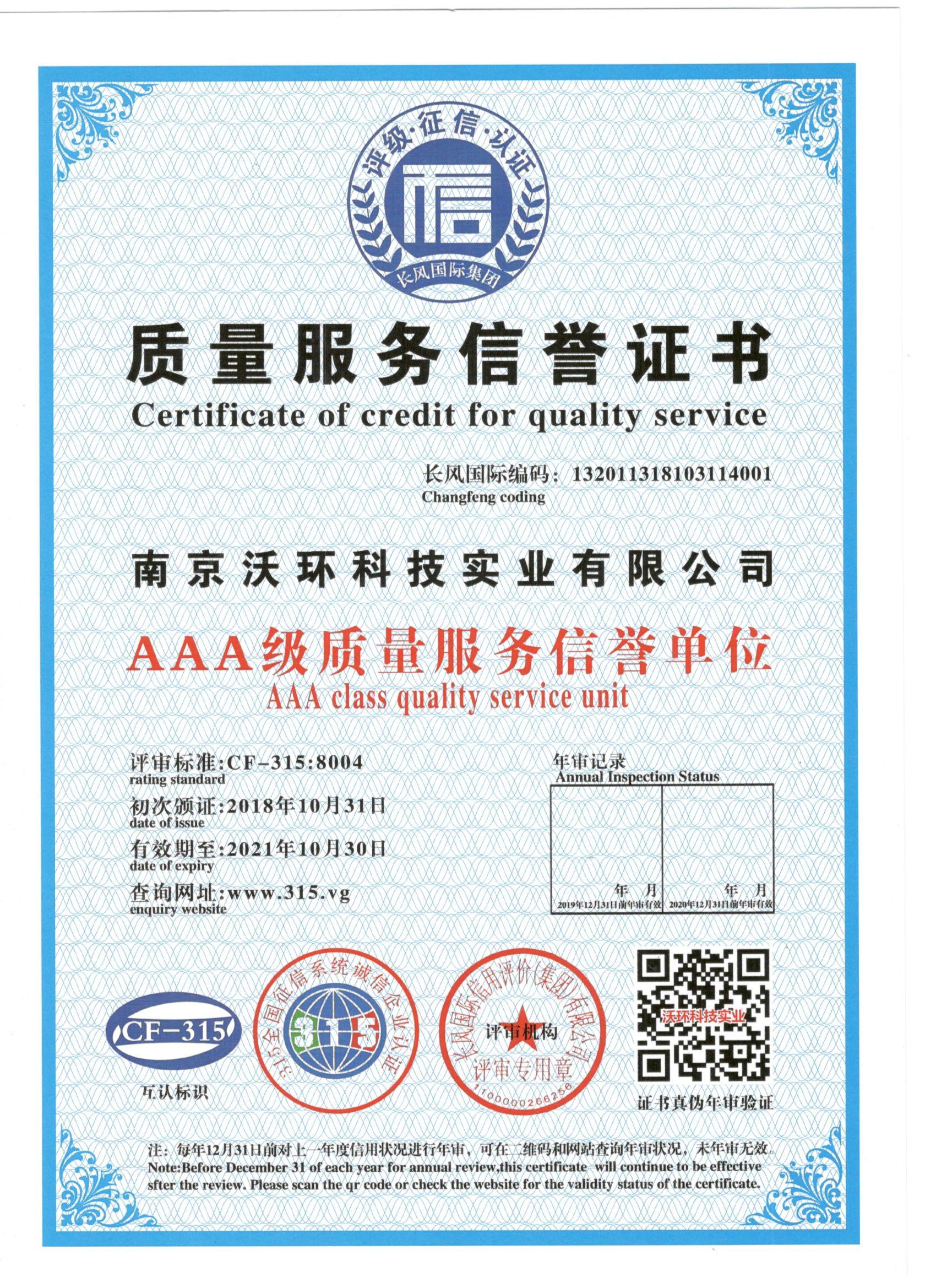 熱烈祝賀南京沃環(huán)公司被專業(yè)評審機構-長風國際集團評為AAA級質量服務信譽,特發(fā)此證書